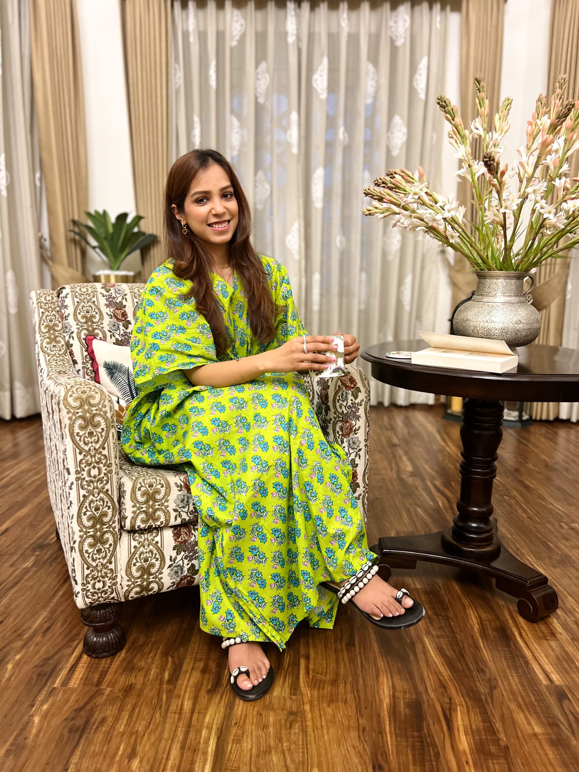 Who doesn’t love a fun splash of colour? Add a pop of colour to your wardrobe with this vibrant Green Floral Kaftan, perfect for bringing some brightness to your day.