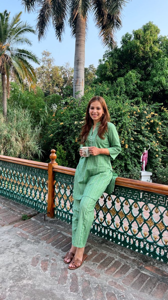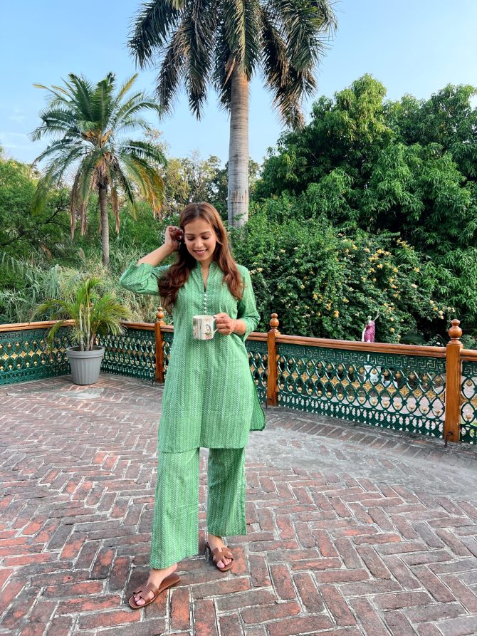 This Green Loungewear Set is your perfect blend of comfort, simplicity, and understated elegance. Crafted in 100% breathable cotton, this two-piece set features a relaxed-fit kurta paired with straight-leg trousers, both adorned in soft green tones with a subtle, hand-block inspired chevron pattern.